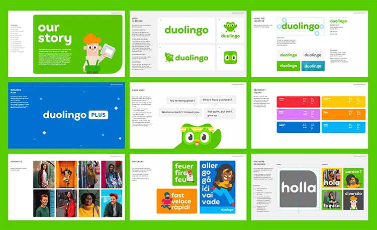 来自英国伦敦的设计机构 johnson banks 负责了Duolingo本次整体视觉形象系统的升级任务。在Duolingo原字标Sans-serif字体的基础上,设计公司将吉祥物“Duo”的部分特点融入字母设计中,例如 Duo 头部特征和字母“g”右上角的圆润小角,Duo的翅膀和字母“a”右侧笔画的关联。